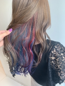 2020年05月27日 ブログ written by: Katsumi カラフルインナー こんばんは水谷です! カラフルインナーのご紹介です★ 表面は明るめのオリーブベージュにして、 インナーはカラフルなブルー、ターコイズ、ピンク、パープルにしてあります! 結んだときや巻いた時可愛いです♡ 抜けてきて色が薄くなるのも可愛いのでオススメです★ 前の記事: 夏は必須!頭皮ケア 次の記事: Blood orange