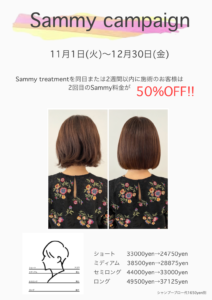 2022年10月29日 おすすめメニュー サロンのNEWS written by: Junko Sammy campaign 今年の冬もSammy treatment 2回目50%OFFキャンペーンを実施します🙌🏻 期間は来週11月1日〜年末12月30日まで 同日または2週間以内に2回Sammyを施術された方は2回目の料金が50%OFFになります🎉 年末年始きれいな髪の毛で気持ちよく過ごす準備をしましょうー! 前の記事: BBQ🍺 次の記事: information